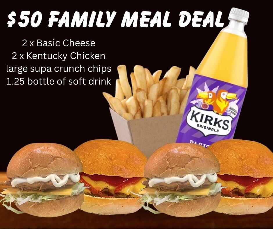 2 x Basic Cheeseburgers, 2 x Kentucky Style Chicken Burgers, Large Supa Crunch Chips with chicken salt & 1.25 ltr bottle of Pasito
